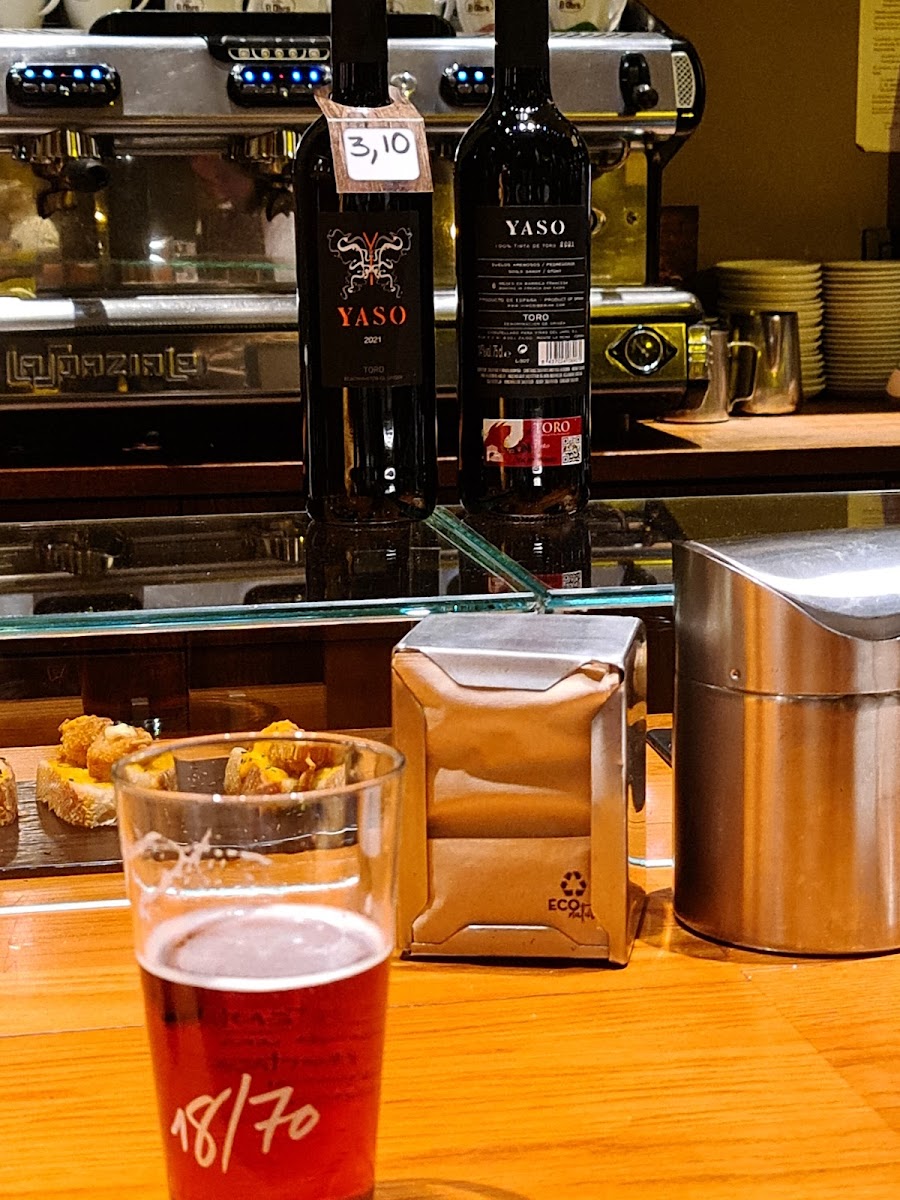 The pinchos here are very delicious, unfortunately on Tuesday’s night only one of them was still available. The building where the place is, is under construction, so it’s not that nice as it could be, if you want to seat outside. I don’t know what was the problem, but instead of two different vermouths, we got only one. But it might have been a misunderstanding between the bartender and me.